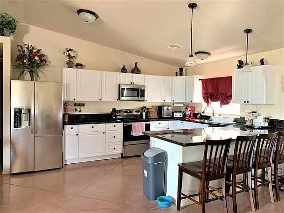 Modern, bright, and open floor plan built in 2019. Beautiful colored concrete floors, granite kitchen counter tops and stainless steel appliances. Property is on an acre of fenced land with no HOA and views of the Tucson Mountains. Agent is related to Seller.