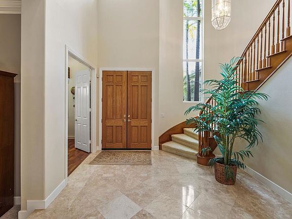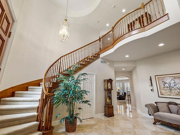 You'll find luxury living in this prized and prestigious Rancho Carrillo Estates gated community! This gorgeous executive home has it all and offers a host of quality upgrades. The highly desirable 4,476 sq ft floorplan by Toll Brothers features a grand entry foyer with a stylish staircase and an adjacent double door entry office or den. The light and bright gourmet kitchen is the heart of the home and is centrally located with formal living and dining on one side and informal dining and a large family room featuring a stone fireplace and custom built-in entertainment cabinet on the other side. Also located on the ground floor is a laundry room and an ensuite bedroom, perfect for guests or live-in help. Upstairs is sure to please with a wing containing a huge primary suite, complete with an intimate fireplace and sitting area. The beautifully appointed primary bathroom features a shower for two, Jacuzzi tub, and two separate toilets. The other upstairs wing offers a 2nd family or teen room and 3 bedrooms all accessible from a 2nd stairway. The meticulously maintained exterior and yards have easy care landscaping. A large back patio provides a perfect area for outdoor dining & entertainment and has a built-in BBQ and gas fire pit. Other features and upgrades include travertine flooring, plantation shutters, ceiling fans, dual zoned AC & heating, household water purification system, recirculating hot water and solar electric power.