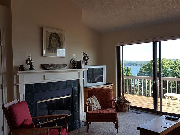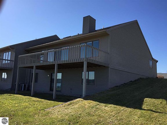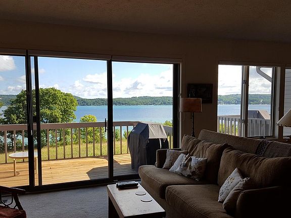 Spectacular views from this hilltop overlooking Crystal Lake. See the lake from every window. Enjoy carefree living in this well established association which includes beautiful landscaping, a pool & tennis courts. Main floor living w/attached 2 car garage. Master suite w/walk-in closet. Main floor laundry. Window wall to lakeside deck. Corner unit gives better views & privacy. Features include fireplace, vaulted ceilings, and a full finished walkout basement w/family room, bedroom & bath, utility & workshop room. Close to Lake Michigan, golf, skiing, & the bike trail.