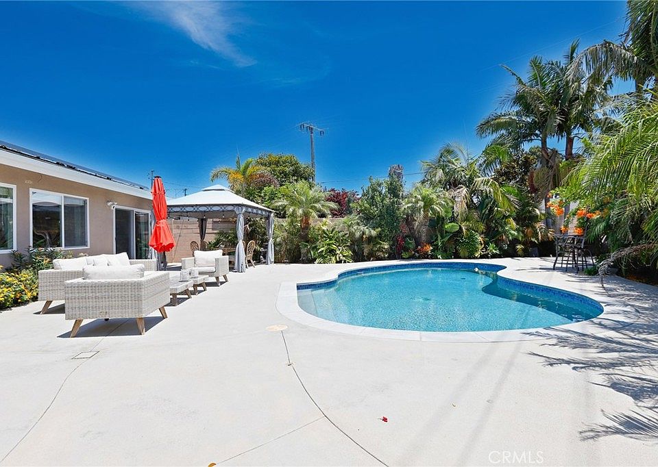 Welcome to 6232 Medford Drive, a tropical paradise home. Located in a quiet, safe neighborhood, you immediately get the island experience in this Huntington Beach dream home. Palm trees, tropical plants, a beautiful pool, a massive driveway and a corner-unit backyard with enough room for an RV, truck, boat, or ADU - with plenty of room to spare for your party guests on the 7000 square foot lot. This stylishly renovated 3-bed, 2-bath single-level home is perfect for your family. From the second you enter the house, you are greeted with bright natural light and a backyard with tropical plants overlooking the HUGE REFINISHED POOL, mature avocado and lime trees, and a tiki bar decked out with lighting, all surrounded by beautiful landscaping everywhere you look! The yard has lighting that illuminates the Hawaiian garden and front yard. The showcase kitchen is beautifully renovated with extra-wide sparkling stone countertops, stainless steel appliances, and a massive walk-in pantry. The house is completely move-in ready, freshly painted throughout, with PAID-OFF SOLAR PANELS, TWO ELECTRIC VEHICLE CHARGERS, built-in home security cameras, central heating and cooling, Nest thermostat, recessed LED lighting, and smart lighting and sprinkler systems. The neighborhood is safe, clean, and walkable to parks and schools, with easy access to the 405 and a short drive to the beach. This home is sure to go fast!