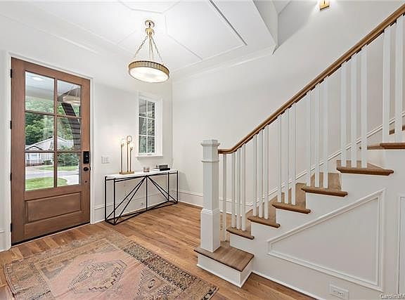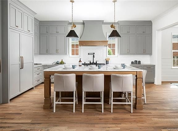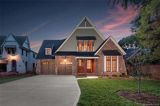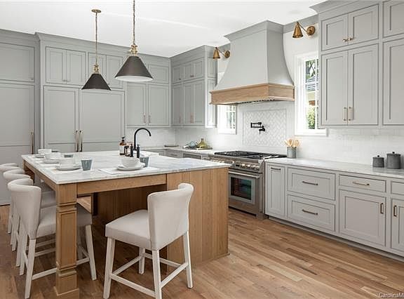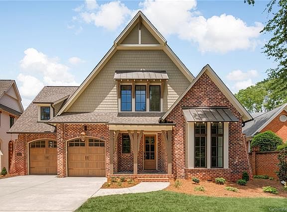 English Cottage architecture (brick wing walls and arched wood garage doors) paired with sophisticated and elegant catalog order interior finishes. A spacious entry greets you and White Oak floors lead you to the living spaces ahead. Simply tap "Welcome Home" via your Lutron automation and the home comes alive. A dream kitchen offers Thermador apps (60" cab-front fridge/48" gas range/etc), marble tops, and locally crafted INSET cabinetry. The dining area contains striking trim detail, while the living room offers a cast stone FP and french doors out to a vaulted porch w/ outdoor FP. The owner's suite on the main has East/West exposure for unbeatable natural light + a Restoration Hardware bath with raised platform soaking tub and enormous walk-in closet. Guest suite also on the main with zero-entry shower. 4 bedrooms & 3 stylish baths up, plus a convenient built-in homework station. 3rd-floor bonus with 2 cubby nooks. Don't miss an unbeatable value in a prime South Charlotte location!