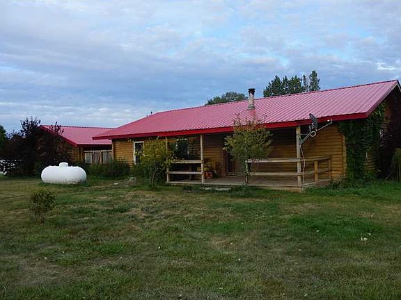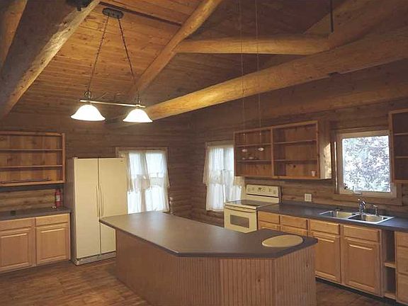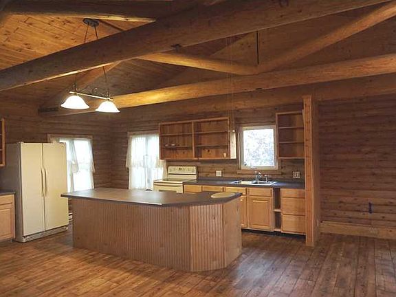 Very nice log home on fenced 1.26 acres. Vaulted ceilings, open floor plan. Island in kitchen, woodstove for supplemental heat, covered back porch, 2 sheds