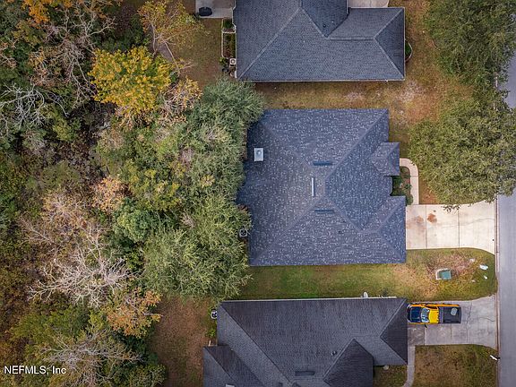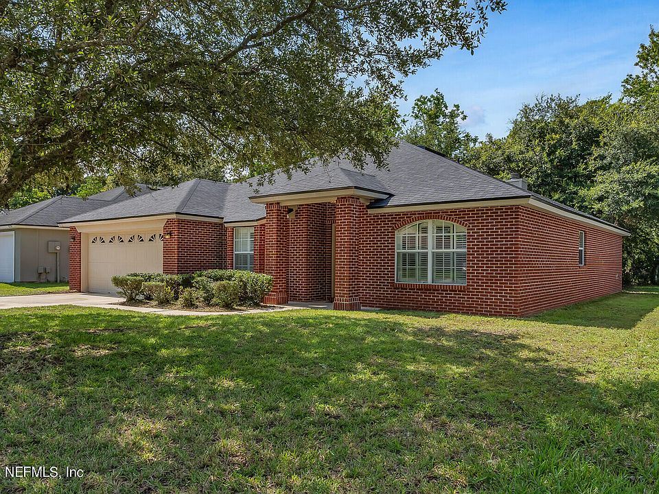The dining room features a bay window with plantation shutters, perfect for enjoying meals with a view. The modern kitchen boasts new granite countertops, sleek flooring, brand-new appliances, and a large pantry. High ceilings throughout enhance the airy, open feel. The master suite includes a walk-in closet and a luxurious en-suite bath with a garden tub. Additional bedrooms offer ample closet space. A large utility room adds convenience, and a covered back patio provides the ideal spot for outdoor relaxation. The 2-car garage offers ample storage, and the friendly community includes a pool without CDD fees. Close to NAS Jacksonville, Costco, and I-295.