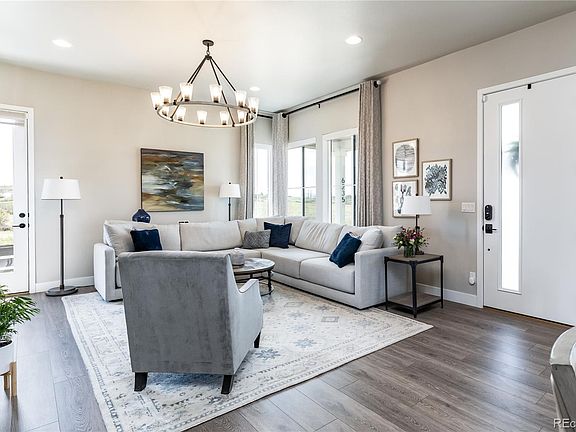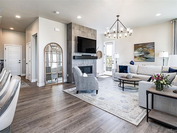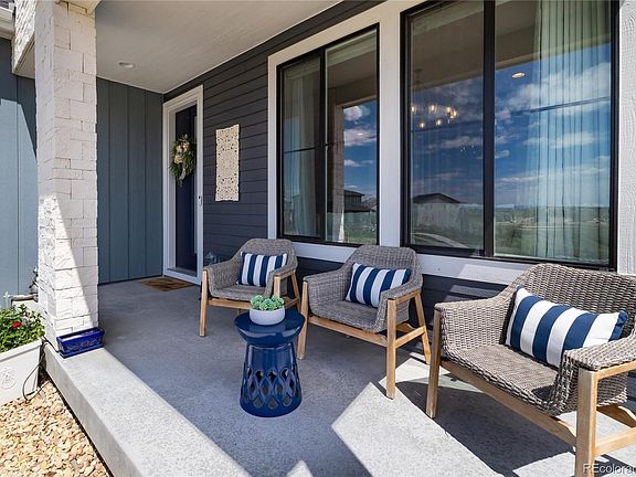 Absolutely stunning home with incredible mountain views in the highly desirable Canyons neighborhood in Castle Pines! Low maintenance, luxury living at it's best with a main floor primary suite * Over $100,000 in designer upgrades since the owner purchased the property brand new in 2022 * Every detail sparkles in this meticulously maintained beauty . . . better than new and shows like a model home * Light and bright with sun drenched spaces * Gourmet kitchen with Quartz countertops, white cabinetry with soft close doors and drawers, stainless appliances including a 5-burner gas range, roll-out shelves, large island with a stainless sink * The open floorplan is ideal for entertaining and easy living * The living room features tons of windows, a gorgeous tiled gas fireplace and custom lighting * Main floor primary suite features a sumptuous bath with a dual sink vanity, free standing tub, walk-in shower, and a fabulous walk-in closet with custom built-ins * Main floor laundry features a custom wood folding counter and built-in cabinets * Built-in bench, cubbies and hooks at garage entry * Upstairs features two bedrooms with walk-in closets and a full bath * Fully finished basement is perfect for watching movies or games, with two additional bedrooms and a bath for guests * The incredible list of upgrades includes custom light fixtures throughout, custom window well liners, custom mirrors, custom wood stairs, all carpet has been replaced with luxury vinyl tile, new lighting in the garage, custom Closet Factory closets in three bedrooms, custom office built-in upstairs, alarm system including window and door sensors and two security cameras; custom wall detail in basement landing; and so much more!! Neighborhood amenities include 15 miles of trails, parks, the Exchange Coffee House, the Canyon House featuring a restaurant, fitness studio, and an outdoor patio and fire pit * Resort-style pool and a Central Park for events and concerts!