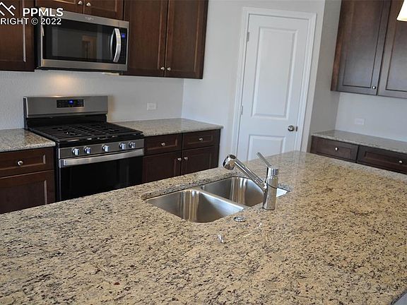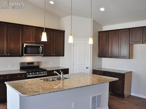 Ready now! Parade ranch plan in Wolf Ranch. Traditional style home with welcoming front porch. 4 beds, 3 bath, 2 car garage home. Open concept kitchen, great room and dining. Lovely kitchen features warm brown 42" upper cabinets, granite countertops, pantry, and stainless steel appliances including exterior venting gas range. Two car garage has 4' forward extension to offer more space for longer vehicles or extra storage. Master bedroom walks through to bath featuring large shower with seat, double sinks, separate toilet room and linen closet. From the master bath walk in to large closet. Basement has 1' taller walls, large rec room with wet bar, 2 bedrooms with generous walk-in closets, 1 bath, and plenty of unfinished storage space. Home includes air conditioning and smart home package. Exterior living space has covered patio perfect for enjoying Colorado virtually year-round.