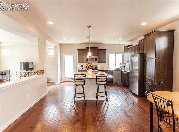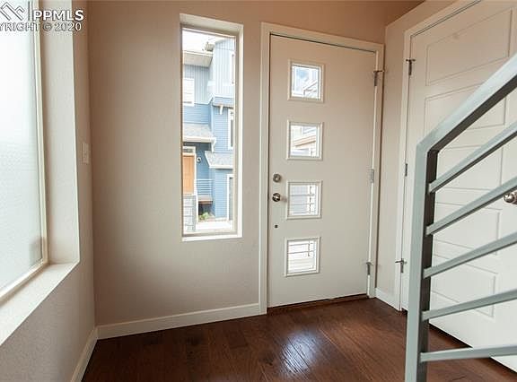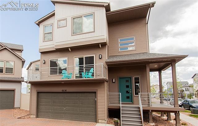 Welcome to this beautiful 3-story with extensive upgrades in the low-maintenance Banning Lewis Ranch Carriage House community! So much natural light in this spacious home! Open layout on the main includes walk-outs to two decks to enjoy outdoor Colorado living. Kitchen boasts upgraded knotty alder cabinets, large island that seats up to 8, slab granite countertops, engineered hardwood floors, large dining area, and is open to the sizable living room. Walk out to the large balcony off the living room or to the balcony off the kitchen, a convenient grilling spot. Upstairs the master bedroom includes an adjoining walk-in closet and bathroom with double vanity, oversized shower with upgraded poured river rock shower pan, and modern opaque glass barn door. Two additional bedrooms, full hallway bathroom, and convenient laundry room complete the upstairs. The walk-out lower level includes a family room, half-bathroom and additional space perfect for office, play area, or workout room. Enjoy all of the natural light from extra windows throughout the home. Also, there is ample storage in the lower level under the stairs, in a heated crawl space that spans the lower level area, and overhead in the garage. The HOA maintains the front lawn and sprinkler system, and will blow out the backyard sprinkler system for an additional fee. Don't miss the nearby neighborhood playground, dog park, heated splash park, and community center with gym, outdoor pool, and fitness room. This desirable neighborhood also has numerous walking trails, community events, and top-rated charter schools. This low-maintenace home provides time to enjoy the many community amenities! Come see this gem before it's gone!!!