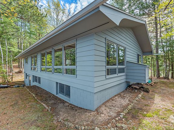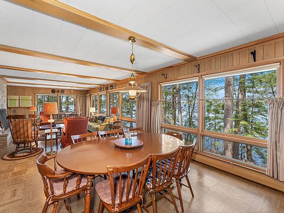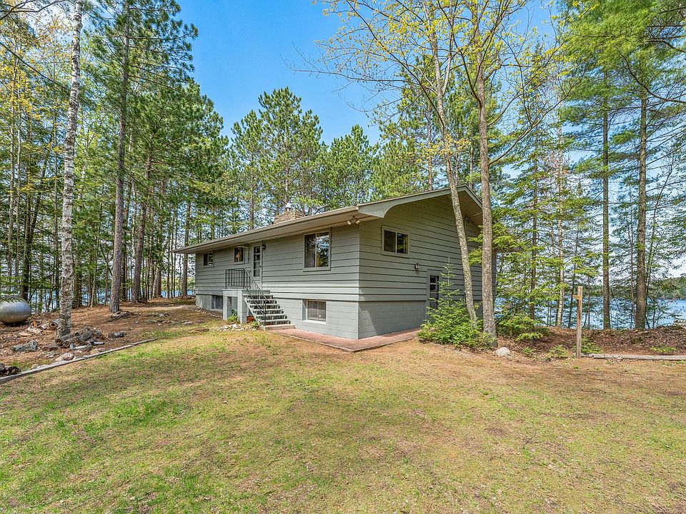 Idyllic 3BR/2BA home (additional bonus rooms) sits on 3.82 acres of wooded land with approx. 1,135 ft of frontage providing an exceptionally private setting. Extraordinary views of Muskellunge Lake are enjoyed through large picture windows, and the pier is just steps from the house. Perfectly situated on the land, this home features quality craftsmanship with an impressive Tennessee Crab Orchard stone fireplace, ¾” bleached black ash hardwood walls and thoughtfully-designed layouts throughout. Open concept kitchen/dining room/living room with lake views throughout. The family has lovingly maintained the nostalgic feeling of the home, as well as preserved a sense of connection with the land. Sunset light filters into the main living area, and the pier offers sunsets, Northern lights, loads of stars and undeveloped state-conserved land as a backdrop. If you’re looking for a peaceful and beautiful setting, yet within ½ hour of Minocqua and Rhinelander, this home could be for you!