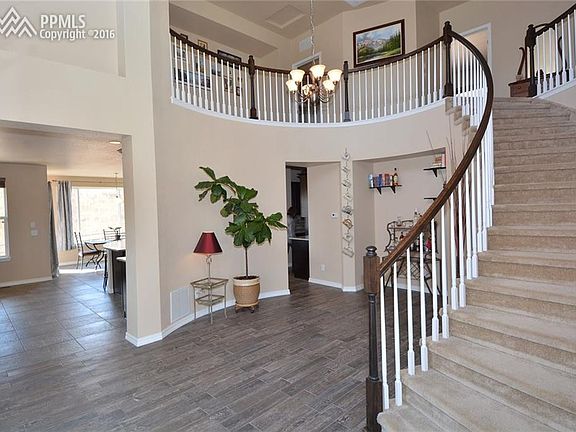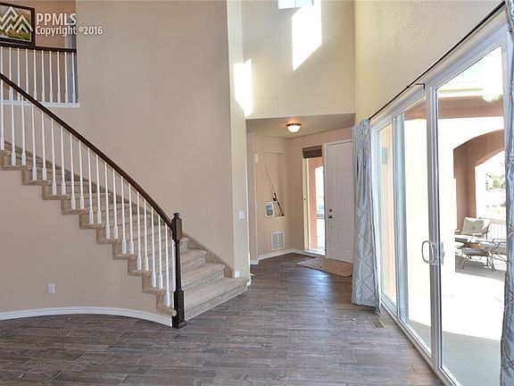 Absolutely gorgeous home that feels like your own private retreat, but is conveniently located near I-25, AFA, shopping, and parks! Fantastic location in D-20! Beautiful gourmet kitchen with stainless steel appliances and huge island perfect for prep and entertaining. Kitchen opens to great room with fireplace! Separate formal dining area with walkout to the stamped covered patio with a fire pit! Luxury master suite with a walkout to a separate deck, amazing walk-in closet, adjoining laundry room, and gorgeous master bath! Upgrades throughout! All bedrooms have adjoining bathrooms! Tons of extra work space, with a main level office. Landscaped wit auto-sprinklers in the front and xeriscaped in the back. Backs to open space for even more privacy! Fantastic views of Pikes Peak! This home is stunning, imaculate, and really has it all!