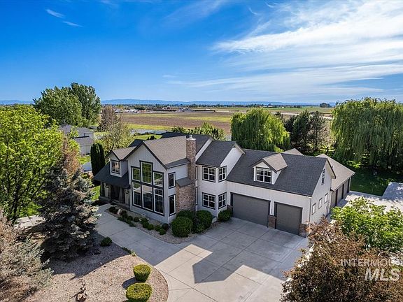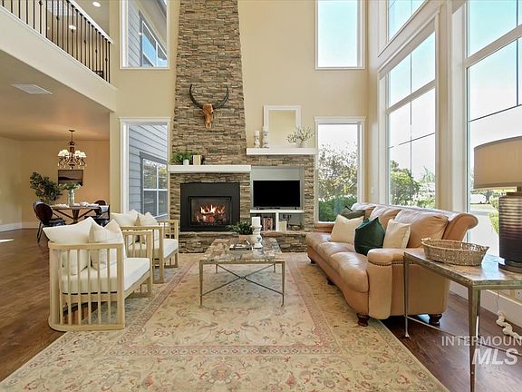 This spacious home boasts two-story windows and a two-story stone fireplace in the main living area, views of the Boise Foothills, two master suites, split bedrooms, dual zone HVAC, a library, a living and family room, remodeled kitchen, gas range, dual ovens, hot water on demand, hardwood floors, hard surface counters and a 3-story laundry chute. Main level master features dual walk-in closets and private backyard access. Ample room for entertaining, a home office, home gym and personal space for all. 5-bay garage/shop is insulated, heated and has a custom stainless steel top workbench area and epoxy floors. Outside find RV power and water both 30-Amp and 50-Amp RV service also. A spacious patio and pergola offer an incredible outdoor oasis for a private moment to sit and listen to the birds, or a location to host your lively guests. A five-minute drive to Spurwing Golf Course, Costco, restaurants and entertainment. Serene, spacious and private this property has everything you could want and more.