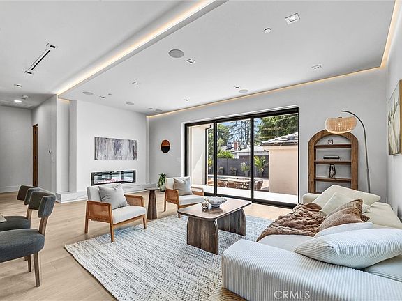 The kitchen flows effortlessly into the expansive living room, where a modern fireplace and built-in surround sound create an inviting ambiance. Oversized pocket sliding doors open to the backyard, seamlessly merging indoor and outdoor living.