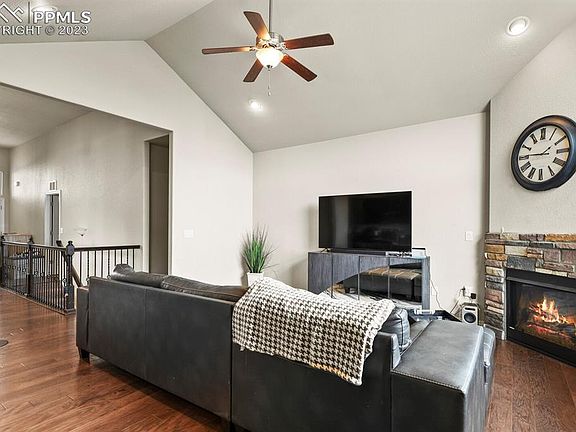 Beautiful ranch home in Mountain Valley Preserve. This home was built in 2017 and is excellent condition. Extraordinary Master bedroom with a double sided fireplace over the tub, amazing master closet with room for all your clothes! Great kitchen with new stainless appliances bought in 2022 and granite countertops. Choose between electric or gas for your oven. Amazing office with built in shelving! Large family room in the basement for spending quality time, as well as two additional bedrooms and a full bathroom. Astounding view of Pikes Peak from the front yard. Sunsets are extraordinary. Come look!