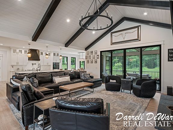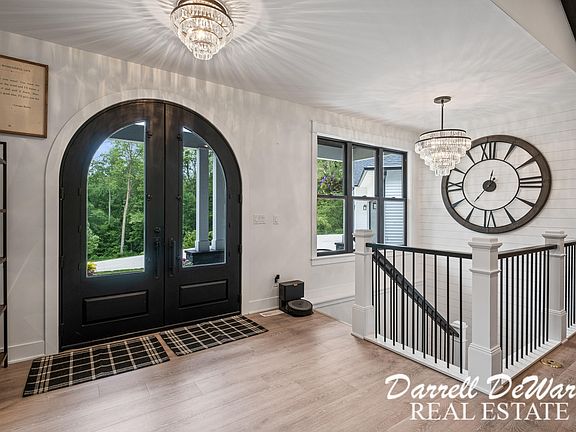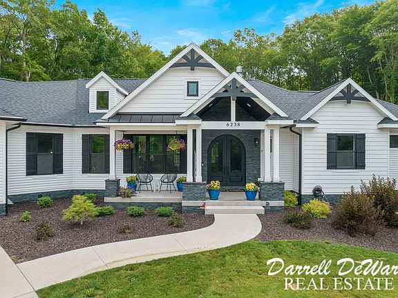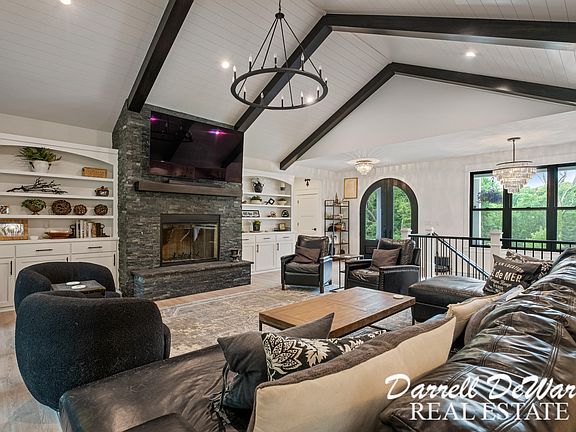 Experience luxury living in a private 3.5-acre country setting with this custom-built, 6-bedroom, 4-bath Middleville walk-out ranch. From the moment you open the custom double steel door, you are greeted by flawless design and high-end finishes. The massive gourmet kitchen boasts high-end appliances, an oversized island, and a huge hidden walk-in pantry with a 5-in-1 and icemaker. It opens to a large family room perfect for entertaining, featuring cathedral ceilings with custom beams, a large fireplace, and custom built-ins. Enjoy almost year-round living on the enclosed porch with Anderson double sliders, a gorgeous fireplace, and spectacular views. The main-floor primary suite includes a large bedroom with a paneled accent wall, a bathroom with a heated marble floor, quartz countertops, a Kohler therapeutic soaking tub, a marble shower, a spacious walk-in closet, and access to the deck. The lower level offers a living room with a wet bar kitchenette, patio access through double sliders, 4 bedrooms- one bunk-bed room for sleepover parties, and 2 full bathrooms. This home is filled with natural light and the property features everything you'd expect- maintenance-free composite decking with aluminum railing, a whole-house generator, professional landscaping, underground sprinkling, a custom tile pet shower in the mudroom, high-speed fiber optic internet, and ample space for a pool.