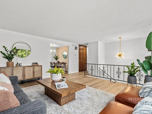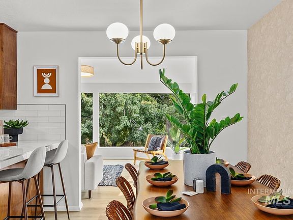 Welcome to this charming mid-century split-level home, thoughtfully updated and perfectly situated on a serene half-acre, park-like lot with tranquil water views. This beautifully maintained residence boasts four spacious bedrooms and two bathrooms, offering a versatile layout for both comfortable living and entertaining. Recent upgrades include new flooring throughout, a fresh coat of paint on the interior, and new lighting fixtures in several rooms. The lower level features a large rec room with direct access to a covered walk-out patio, ideal for year-round outdoor enjoyment. Blending mid-century character with contemporary enhancements, this home presents a rare opportunity for peaceful waterfront living, all just minutes from downtown Boise, Boise Towne Square, the airport, and nearby conveniences.