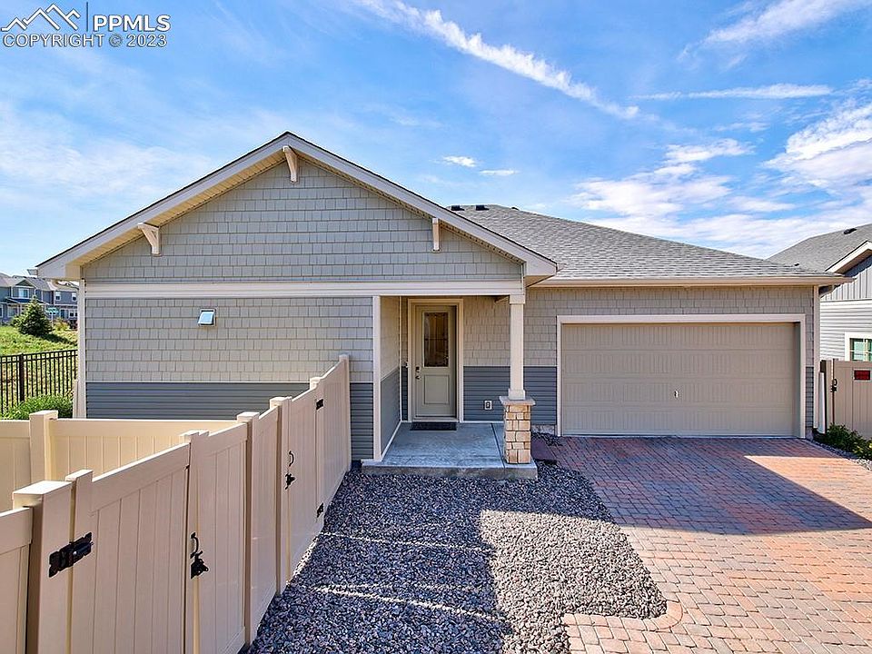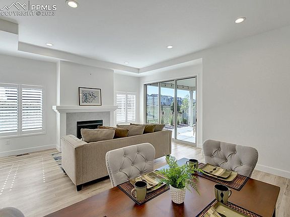 Why wait to build in the Retreat at Banning Lewis (a 55+ active adult community), when you could buy this better than new home? Built in 2021, you will love the stunning wide open floor plan from the moment you walk in. There are well appointed upgrades throughout including KitchenAid appliances, a gas stove, convection oven, granite countertops, 9’ ceilings, and upgraded wider baseboards. This is truly main level living with both the master, laundry, and an additional "flex room/office/bedroom" located on the main level. One of the best features of the home is the oversized sliding doors from both the living room and the master. It truly creates an indoor/outdoor Colorado Lifestyle entertainment space. There are plantation shutters in the living room, and you are sure to love the gas fireplace when it is chilly outside. The basement is perfectly finished with upgraded high-grade carpet, an additional bedroom and full bathroom. The metro district provides snow removal - so no need to shovel! This community has a community center with fitness facilities, pickle ball courts, walking trails, and a pool opening this spring. No waiting for construction - move right in!