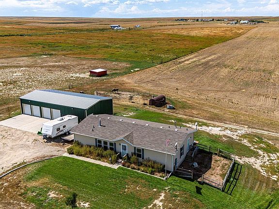 basement features a family room, two bedrooms with custom closets, large bathroom with step-in shower and extra space, and an unfinished bonus room perfect for storage, exercise room or a workshop! The oversized 5 car garage is a perfect workshop and features an exterior access door and a RV access door, a dedicated gas line for heat, 4 single car garage doors! The property also includes sprinkler system to maintain the lawn, corral so you can bring your horses or other animals, and panoramic views of the eastern plains for miles. The seller has a leased wheat crop that is maintained and harvested by a "sharecropper" for added income. Don't wait to call this YOUR home. Call today for your private showing!