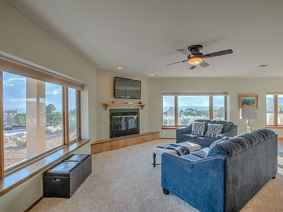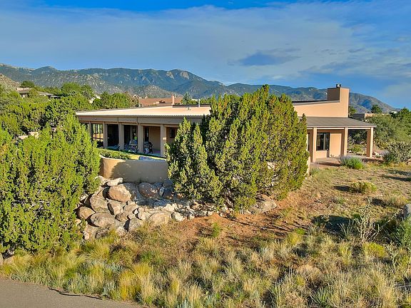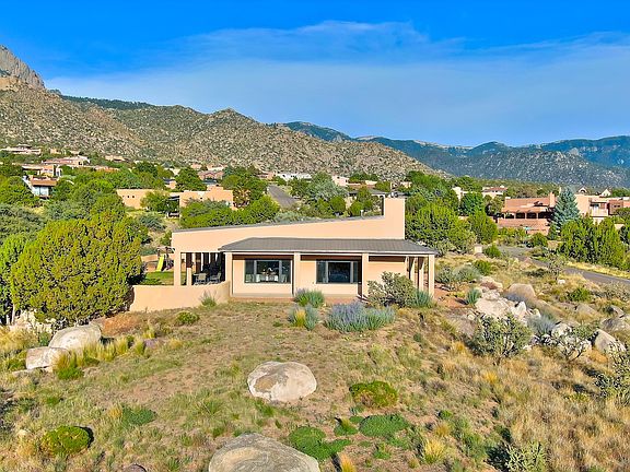 Great location, Incredible Views One level 3 bdrm,3 bath Sandia Heights home. Enjoy unobstructed 270-degree views of mtns & the city & 1250 SF of covered patio space. This home has an excellent floor plan featuring 2 Master Suites, open kitchen, living room w/ fireplace & dining room. Living/Dining area feature huge Pella windows facing west to allow for spectacular views & sunsets. Low maintenance metal roof & one-foot thick insulated concrete walls make this a very well-constructed/attractive home. Home features in-floor radiant heat & refrigerated A/C. Kitchen hosts a walk out to a covered patio & a gorgeous walled backyard w/your own outdoor fireplace and spectacular views! Enjoy a heated 250sq.ft sunroom (not incl in sq ft). Oversized 3 car garage finished w/storage & work shop.