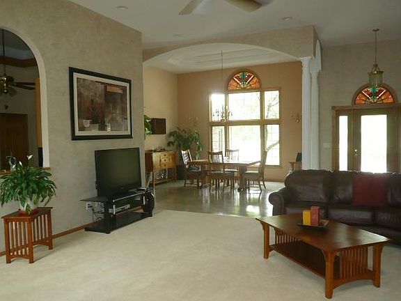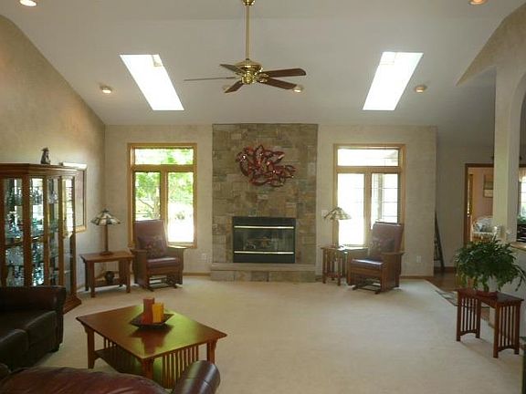 Exquisite 3 BR, 3 BA, 3 car garage on beautifully landscaped 6.55 acres. Living room w/gas fireplace and 12 ft ceilings w/skylights. Formal dining room with 12 ft trayed ceiling and leaded glass accent window. Sun room and 3 season room are perfect for evening while relaxing and watching the water falls. MBR suite with large sitting area and leaded glass accent window. Lower level features spa room with hot tub, rec room, computer area and potential media room currently used as a bedroom. Inground sprinkler system. detached 2 car garage for yard accessories. Out Building 22 x 20. Zoned R-1. Horses OK.