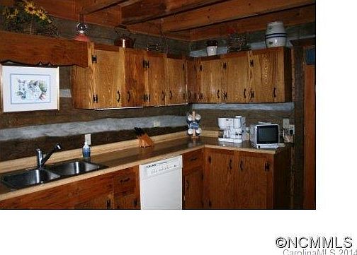 Unique antique log home. 2 cabins with wormy chestnut connector. Covered breezeway to garage, Screened porch off kitchen. Kitchen cabinets are wormy chestnut. Beautiful stone fireplace in kitchen. Living area boasts a 2nd fireplace, cathedral ceilings, rustic features. Updated baths. Oversized 2 car garage with workshop. 3 1/2 lots are included w/this house. Social club membership available. Great value at this price!