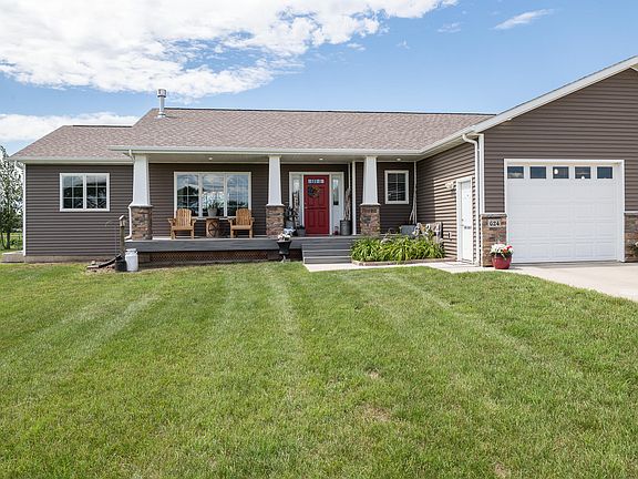 This beautiful 5 bed 3 bath ranch style home located just east of town on 1.72 acres HAS IS ALL! Walking in from the welcoming front porch, you will feel at home. The open concept kitchen, dining and living room have beautiful duraplank floors, vaulted ceilings, and a fireplace. There are 3 bedrooms on the main floor. The master bedroom is filled with natural light, tray ceilings, and dimmable lights. Walking into the master bath is like a dream. Jetted tub, with shower, dual skins and a HUGE CLOSET!! The large laundry room completes the main floor. Downstairs you will find everything to you need to entertain! The wetbar is custom built complete with full size fridge and microwave. The family room is large with room for a pool table or any other games you can think of! The theater room is great for family movie nights or game nights. The whole house has speakers as well. There are 2 more large bedrooms and a bathroom in the basement. Off of the dining room you will find a maintenance free deck with a gas line for a grill and outdoor speakers, a pool, and a patio for a hot tub. The 3 stall garage is almost 1250sq feet. It has a floor drain, hot and cold water, and a heater. There is a camper pad, with water hook ups. You will enjoy the 200+ trees that have already been planted and maintained for you! This one is must see and will not last long.