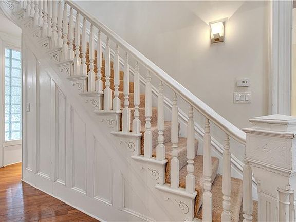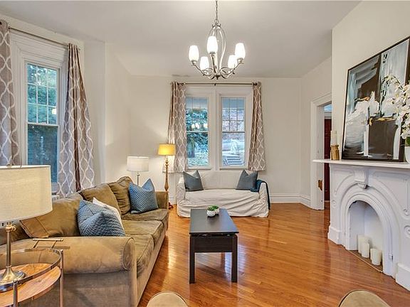 Renovated Victorian Home with two-story foyer, original staircase, front & back porch surrounded by mature trees. The main floor features hardwood floors, a large living room with 12ft ceilings, decorative fireplace & French doors leading to the back porch, a generous dining room & a spacious, renovated eat-in kitchen with dark cherry cabinets, granite countertops, glass tile backsplash & stainless steel appliances. The tastefully remodeled full bathrooms are located on the main and second floor. The large master bedroom and two other bedrooms are located on the second floor. The third floor room can be used as the fourth bedroom, office or game room. The back deck overlooking the garden is perfect for al fresco dining and entertaining. Parking is easy thanks to the covered one-car carport and 3 additional off-street parking spaces in the back. Other upgrades (2017) include: new multi-pane windows, electrical system, roof, boiler and heating system.