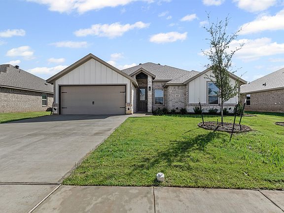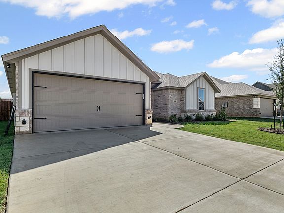 Offering $3,000 in concessions to use towards closing costs, a rate buy-down, or in a way that best suits you. Experience modern style and everyday comfort in this beautifully designed Al Couto home, perfectly situated in the desirable Boardwalk Estates community. From the moment you step inside, you’ll notice thoughtful craftsmanship, wood-look tile floors, elegant crown molding, and soaring ceilings that fill the space with natural light. The inviting living room centers around a gorgeous stone fireplace and opens effortlessly to the chef-inspired kitchen, where granite counters, stainless steel appliances, and a spacious dining area make hosting friends and family a breeze. The private owner’s suite feels like a retreat with its dual sinks, granite vanity, walk-in shower, soaking tub, and an oversized walk-in closet. With a split-bedroom layout, secondary bedrooms enjoy their own space away from the primary suite. Outdoors, a covered back patio overlooks the fully fenced yard, which is perfect for quiet evenings or weekend entertaining. Built with efficiency in mind, this home is equipped with FOAM insulation, a high-performance Trane HVAC with heat pump, and a finished garage with epoxy flooring prewired for an EV charger. Experience quality, comfort, and energy savings in this exceptional home. No HOA, Low Tax Rate, No PID, No MUD.