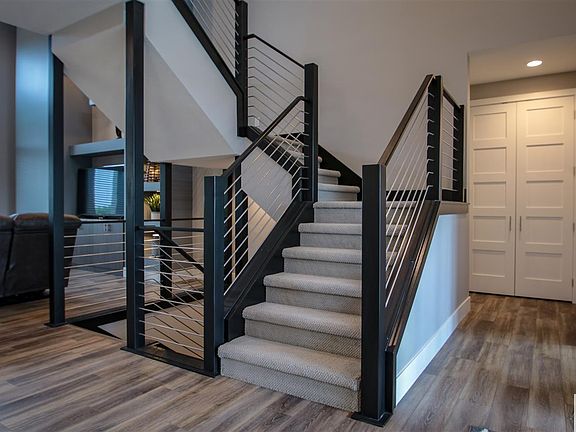 Contemporary 1.5 story home built by Bousquet Construction. This home sits on generously sized lot on a prime cul de sac location with a fantastic golf course view. Very open floor plan even to the upper level with defined spaces and unique touches throughout. Entering the foyer, you will see the focal piece stainless rod staircase system with its contemporary flair and open feel. The entire home has white trim. The main floor and lower level living areas have luxury vinyl plank floors. Convenient office off the foyer has a closet. The formal dining room has large windows and opens to the living room. The living room features contemporary built ins and a gas fireplace as well as 18 foot ceiling which opens to the upper level and features a striking view of the one of a kind staircase. The kitchen has a 9 x 4 hidden pantry, modern & sleek flat front cabinets, SS appliances, granite counters and a dining area with floating buffet. Off the dining area is a 13 x 16 maintenance free covered deck with steps to the large, flat yard. Main floor also has a laundry room and a large guest bath. Throughout this home you will find closets galore for all your storage needs. The main floor master suite has a large bedroom with golf course view and perfectly placed windows to fit your king size bed and a master bathroom with dual sink separate vanities, a tile walk in shower with rain shower head and a second shower head as well. The walk in closet is a dream with all the perfect built-ins. Second story features three large bedrooms (two have walk in closets and one has a double closet) and a large full bathroom with a double vanity, tub/shower and tile floor. The lower level has a expansive family room area with natural light pouring in from the daylight windows and a wet bar with granite counter. Two more large bedrooms (one has a walk in closet and egress window and the other has a double closet and a daylight window. Full bathroom has double sink, vanity and tub/shower combo