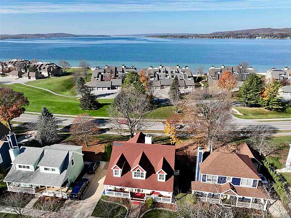 Welcome to the heart of beautiful Boyne City where the pristine neighborhood of Harborage Park embraces all with comfort and manicured beauty. Quality construction and LOCATION make this property a promising contender of your next forwarding address! This home features 3 bedrooms and 2.5 bathrooms, a 1616 sq. ft lower level complete with a second laundry room and a Bilco Door for easy storage access. A tastefully added shed on the side of the house for all yard tools will compliment any green thumb. The real showstopper of this home is the upgraded front porch, completely enclosed by floor to ceiling windows for maximum natural light and a gas stove for warmth all year round! There are seasonal views of Lake Charlevoix from all lake-facing windows and sensational park views from the front door and welcoming front porch. Custom beveled glass doors fracture the sunlight within the home in a beautiful and mesmerizing fashion. With a main floor master bedroom and ensuite, grand open-concept living room and kitchen, beautiful granite countertops, formal dining room, cathedral ceilings, and a toasty fireplace drawing you to sit and stay a while. Harborage Park offer amenities of pristine shared grounds including tennis courts, a putting green, community park and gazebo, and 100 ft. of neighborhood frontage on the north arm of Lake Charlevoix. Welcome to Harborage Park, the diamond of Boyne City!