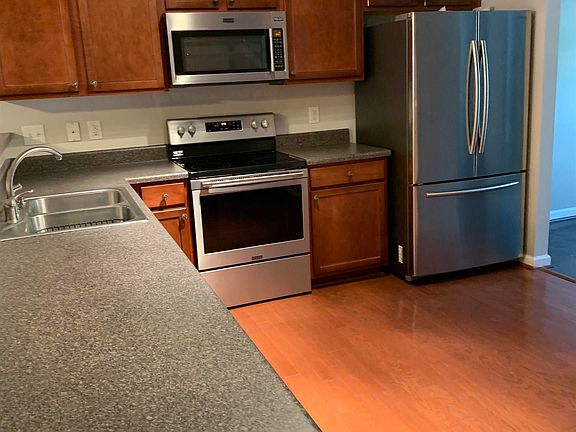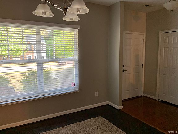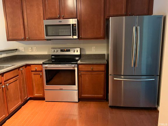 Live in this generously spaced, impressive townhome in Knightdale's desirable Wide Waters Village. Beautiful new coffee oak hardwood floors upstairs and down, coupled with finished concrete in the living and dining. Open layout on main level boasts 9 ft ceilings, with charming fireplace and raised bar level countertop perfect to entertain. Upgraded kitchen includes new stainless steel Maytag appliances. Exterior highlights: walking trails, covered porch, and private rear parking for wonderful curb appeal.