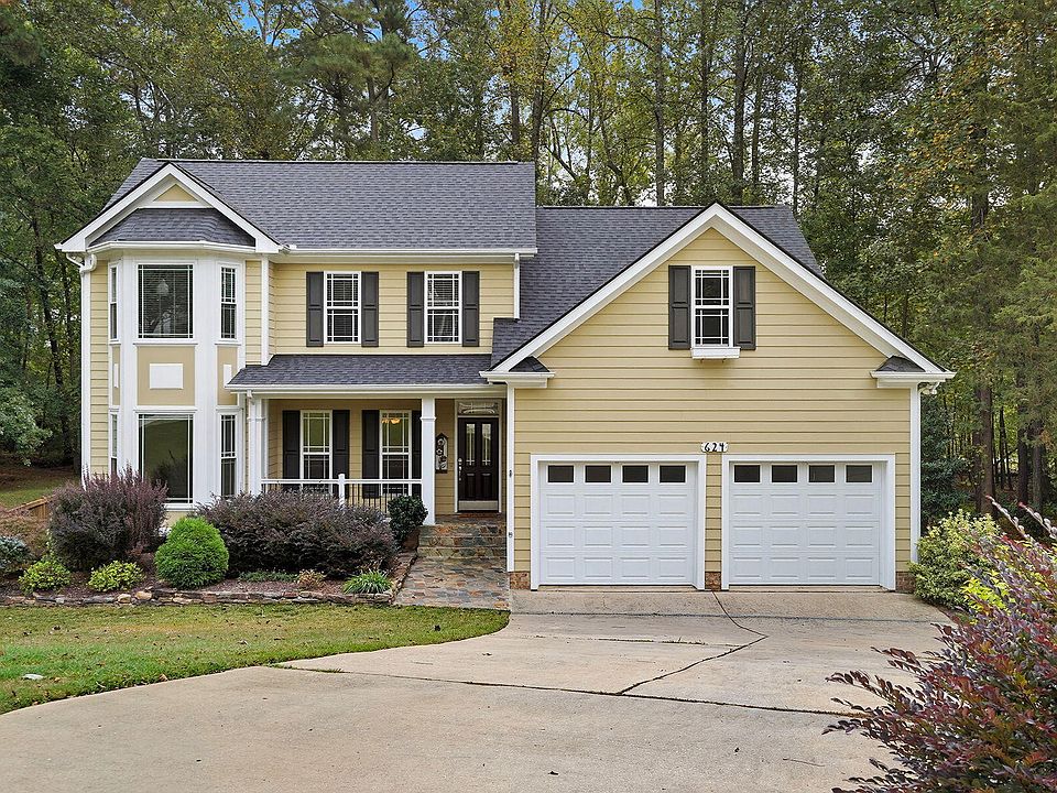 Beautiful home located on a landscaped 0.63-acre fenced lot with blooming flowers and mature plantings. Featuring a new roof, 3 bedrooms, a spacious bonus, and flex room ideal for an office, gym, or guest suite. The first-floor primary suite offers comfort and privacy. Open kitchen with quartz countertops, eat-in and formal dining areas. Light-filled living and family rooms with skylights and a cozy stone, vented fireplace. Major systems updated. Large back deck overlooks a wooded yard with paver pathway—plenty of room to garden, play, or relax. Just 5 minutes to downtown Wake Forest, close to the Greenway and Flaherty Park.