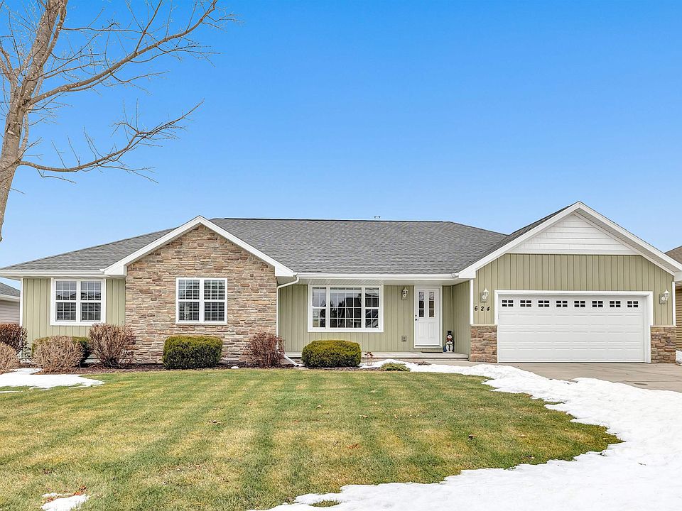 Well maintained ranch home in the growing popular Hobart Centennial Centre neighborhood. Spacious kitchen offers maple cabinets, SS appliances, snack bar and pantry. Patio doors off dining area lead to beautiful stamped patio. Corner gas f/p in living room. Good sized master suite has a tray ceiling, w/i closet and full private bath. First floor laundry and washer & dryer included. Other home features include open concept, cathedral ceiling, four panel doors, inground sprinkler system for front yard, one stall of garage is extra deep.