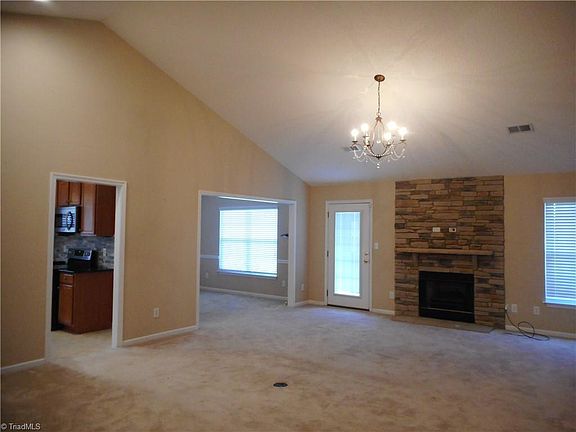 Well maintained 1 story Ranch Style home in Kernersville NC. .22 acre level lot. Ready to move in condition. Large open rooms with vaulted ceilings. 3 bedrooms and 2 baths. Built-in storage cabinets in the primary bedroom walk in closet. Kitchen with double oven/smooth top range, stainless steel appliances, granite countertops, pantry and beautiful stacked stone backsplash. Formal dining room and eat-in kitchen. Beautiful stacked stone fireplace with electric (removable) logs. Low maintenance vinyl windows with custom blinds. Spacious HEATED/COOLED 2 car garage with built-in storage cabinets. HVAC replaced 2 years ago. Private back yard with a very nice view. Convenient location near shopping, dining and highways. Washer, Dryer and Refrigerator will remain. All appliances are less than 5 years old. Security system installed.