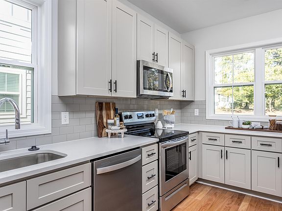 MOVE IN READY! Welcome to Pineview Townes! This brand new, interior unit is just minutes from all Downtown Raleigh has to offer. Complete with hardwoods throughout, this open floor plan home screams contemporary living at an unbeatable price. Chefs forward kitchen with stainless steel appliances, 42" cabinetry, a beautiful wrap around white carrera quartz countertop and 9' ceilings. Floor to ceiling-tiled walk in shower, tiled bathrooms and two primary suites equipped with built in desks. Tons of natural light throughout entire home. A MUST SEE! Colors and layout may differ from pictures depending on unit. Investors Welcome!
