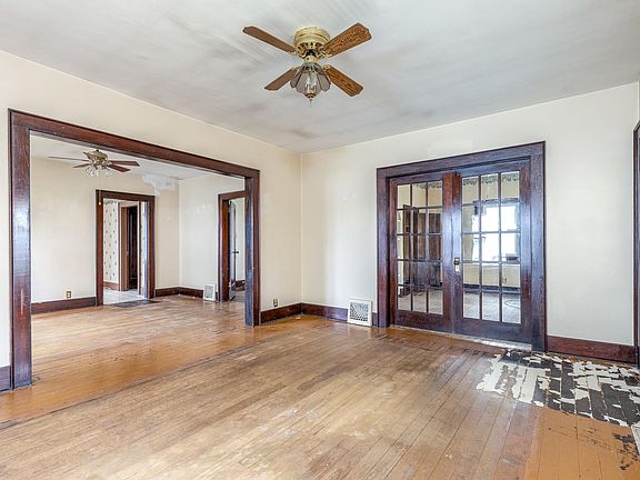 Check out the original woodwork in this home! There is a living room with bay window and French doors, dining room, kitchen, laundry room, two bedrooms and a bath plus a full unfinished basement. Some carpet has recently been removed to expose the wood floors! There is a 56x180' yard with detached one-car garage. Possession at closing! Call today!