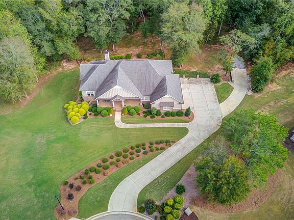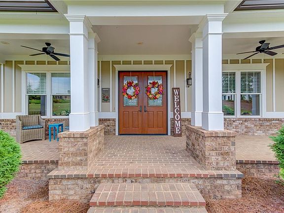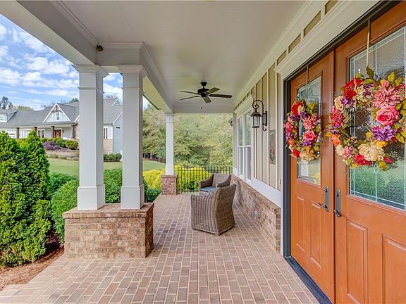 This wonderful custom ranch has a brick front porch that leads inside to the foyer with views through the living area to the back deck. With the tall coffered ceilings in the living room, wood burning fireplace, and huge open dining room, you'll be ready to host dinner. The kitchen includes substantial counter space on unique granite tops with island, butlers pantry, walk-in storage pantry, double oven, stainless farm sink, vent hood, and more! The hickory hardwood floors continue throughout the main level common areas. The master bedroom on the main includes a large bathroom with separate vanities and tiled shower and floor. Two secondary bedrooms on the main level share a jack&jill style bathroom. An open stairwell leads to an amazing terrace level with huge entertaining space along with additional living. With 10' ceilings and full daylight, you'll never feel like you're downstairs. Large living room with bar and game room leads outside to the lower patio with full privacy. A bedroom suite with full bathroom and shower contains another flex room that can be a bedroom, office, craft room, or workout area. There are multiple unfinished areas for additional storage or other use. This cul-de-sac lot provides easy access to the 2+ miles of neighborhood greenspace trails along the Mulberry River. But wait, there's more... a community clubhouse, pool, pickleball courts, 2 fishing ponds, 125+ acres of greenspace, and equestrian barn/pasture/riding ring. This neighborhood is truly a special place. Buyers please note the home next door is also for sale offering a unique opportunity for family & friends.