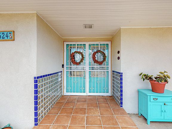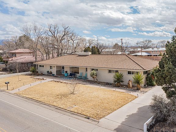 North Valley Gem with updated and mid-century features. This sprawling one-story home sits on a 1/2 acre lot with a pool, 2 living areas, one with a wood-burning fireplace, and one with a pellet stove. Two spacious primary bedrooms, both with 3/4 bathrooms, and one with a walk-in closet. Full bathroom adjacent to the other 2 bedrooms, and the one with pocket doors could also be used as an office/study. The beautiful and bright kitchen with granite countertops, an island, a large pantry, and a pass-through window bar. All appliances stay. The amazing backyard features a covered patio, pergola, pool, storage sheds, raised beds, and OWNED solar panels. Ditch rights . Adjacent to bridle path for Bosque access.