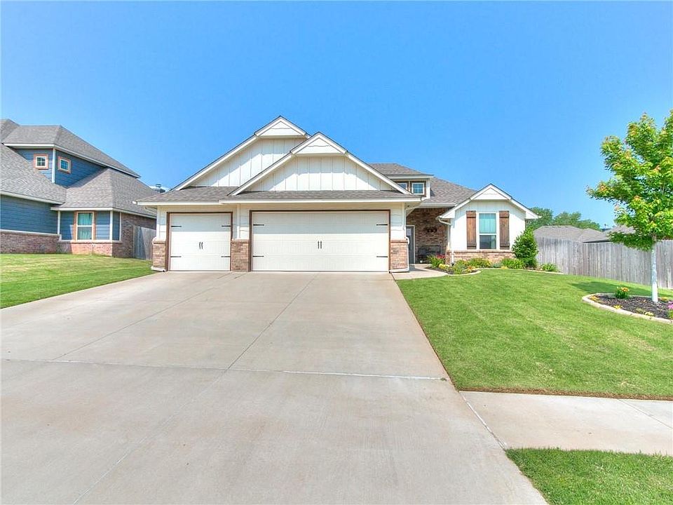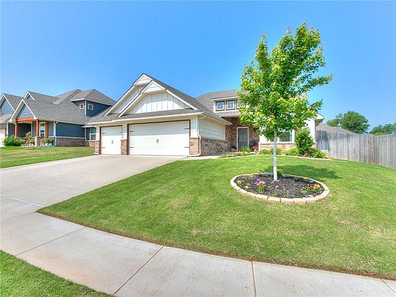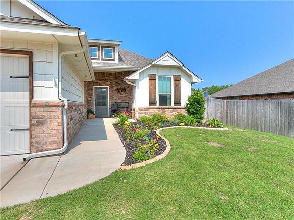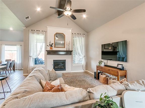 Beautiful Modern Farmhouse Design Home Located in Yukon's Frisco Ridge Neighborhood. Home features 4 BEDS | 2 BATH | 3 CAR GARAGE + STORM SHELTER. You will love the flow of this home, the light and bright feel throughout the floor plan. Living area features vaulted ceilings, stained wood high beam, gas fireplace w/ white shiplap, brick design tied together with a stained mantle piece! Kitchen is fully equipped with walk-in panty, oversized island, quarts countertops, timeless white subway tile backsplash, cabinets to ceiling, pendant lighting, Gas Cook Top & SS Appliances. The owners suite has dual vanities, separate walk-in closets, large soaking tub and walk-in shower. The welcoming back patio offers 325 sq ft of outdoor living a wood burning fireplace, tv hook-ups and a private all wood fence! The construction of this home is top notch with a tankless hot water heater, rain gutters & R44 insulation. Neighborhood amenities include playground, basketball court, soccer fields & a pond!