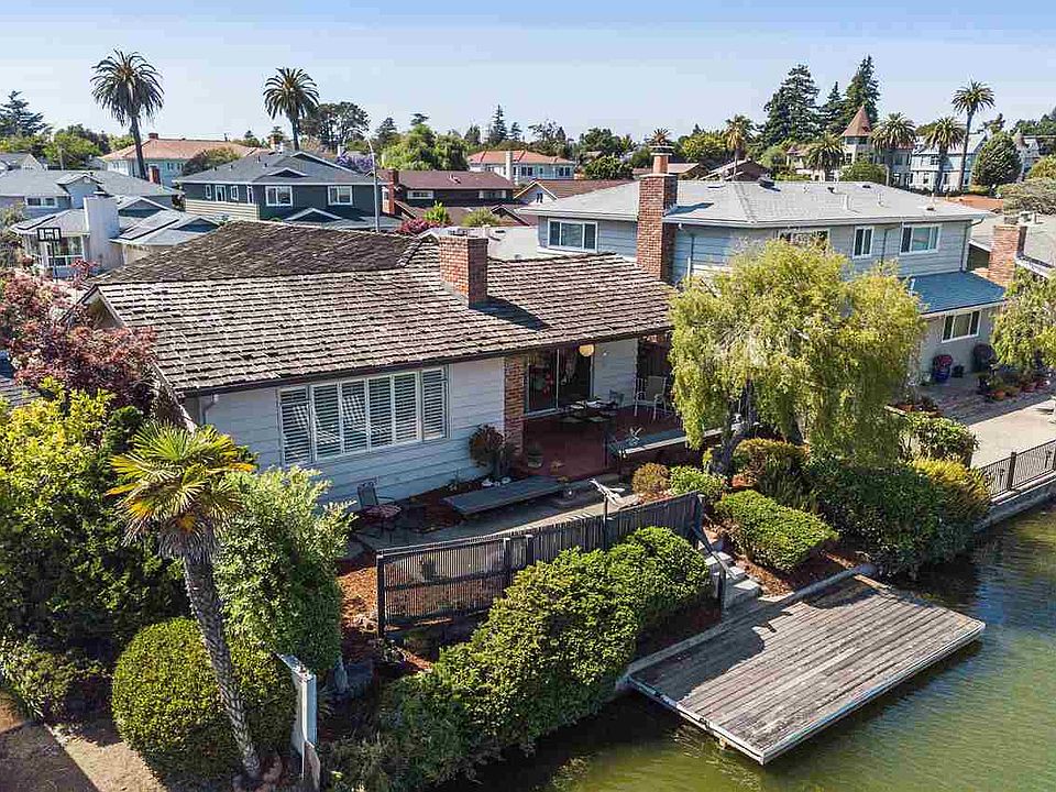 Lovely lagoon home with a cool, mid-century vibe. This single level rancher was built in 1959 by the renowned Sid Dowling, and has a super floor plan which takes advantage of the serene lagoon orientation. The large, light-filled living room boasts a floor-to-ceiling fireplace of mined Texas shell stone, and a picture window with plantation shutters overlooks the tranquil water view. The spacious formal dining room opens to a covered patio seating area with built-in grill. Kitchen upgrades include a glass cook top, double ovens, and a stainless steel refrigerator. The breakfast bar is perfect for informal meals. Three sunny bedrooms each offer generous closet space, and the principal bedroom includes a private bath with a stall shower. Sun-drenched, terraced patios are perfect for long summer evenings, and your kayak has a home on the extra large dock. The cul-de-sac location is a plus, and so close to top schools, the Gold Coast, Alameda Beach, and South Shore shopping and dining.