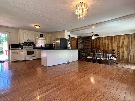 Brick ranch with new roof and HVAC in 2021! Large sunny kitchen with white cabinets, granite tops, tile backsplash and flattop stove. Hardwoods and LVP flooring. Carport was enclosed and laundry room plus large 2 bay workshop attached to the home. Big deck with covered area overlooks large, flat yard and additional storage shed. A lot of house for the money!!!