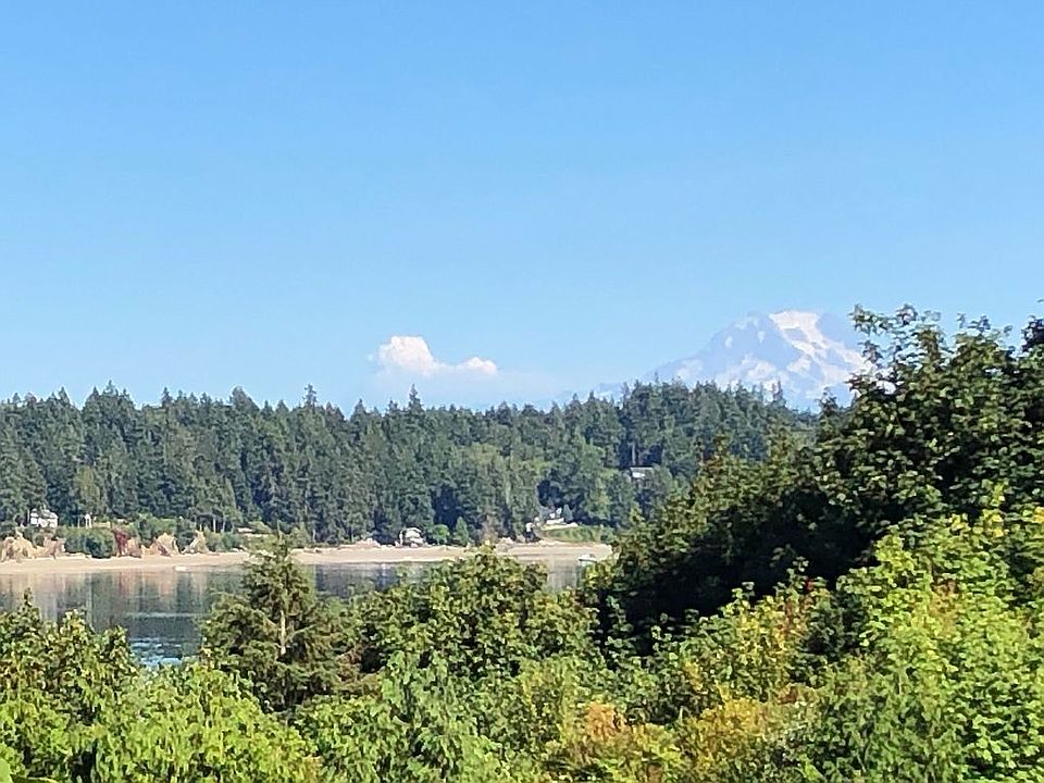 Open concept NW Contemporary classic w/walls of soaring windows reveal stunning vistas of Puget Sound, Eld Inlet and Mt Rainier. Mostly main floor living plus loads of decks, patios, gardens, +hot-tub invite year-round easy-living wrapped in views. Gorgeous wood laminate flooring throughout highlights the flexible plan with flowing great room, open kitchen/dinning, huge main flr. primary suite w/5 piece bath/soaking tub and more. Additional view room for home office or 3rd bdrm option. Retreat to the upper bonus area loft, bedroom w/balcony and full bath. Long .72 acre lot preserves view and privacy. Pretty lane of homes with community trail to water, tennis ct. Quick to west Oly shops/services, Olympic National Forrest, more! Relax!