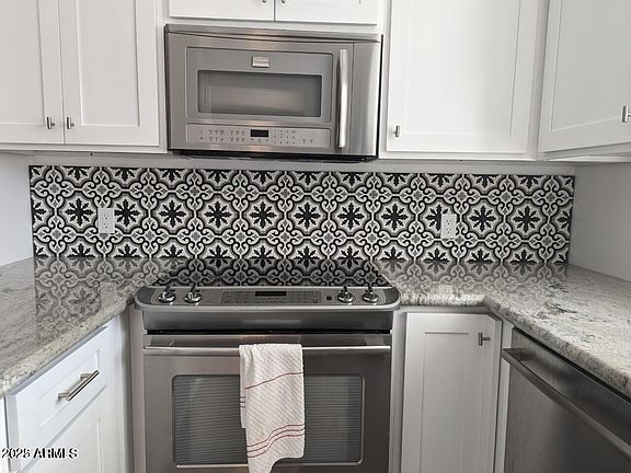 Tiled balconyViews of piestewa peakWine refrigeratorGas grillKitchen backsplashVaulted ceilingsStainless-steel appliances