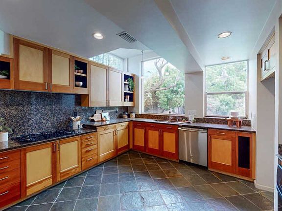 Bored with cookie-cutter homes? Check out this 4/ 2.5 in the coveted Tenaya Park area of NW Fresno. 1 block from the hidden gem that is Tenaya park, hosting many neighborhood events throughout the year. Double front doors lead to an entry with a one of a kind custom staircase. The large separate living room is perfect for a media room, game room, or formal living room. Easy natural slate floors throughout the downstairs. Updated kitchen expansion with stunning views of the backyard, designed by well-known local architect Paul Halajian. A 5 burner gas stove, built-in instant hot and cool filtered water, custom cabinetry, and stone counters. Family room with bar seating next to the kitchen is perfect for entertaining. Double french doors open onto the backyard covered patio. Half bath opens to the backyard. Massive 2 car garage with tons of extra room. All 4 bedrooms are upstairs. The spa-like guest bath and the master ensuite both have double sinks. Walk out balcony is the perfect place to enjoy your morning coffee. Included is a tankless hot water heater, with unlimited hot water on demand. Big backyard has 6 fruit trees, pool with Pebble Tec finish, Olympic diving board, and large shallow end. 2 lawn areas are ready to play on. A convenient built in BBQ plumbed for gas. 3 sheds are included and a very large storage area in the back. This home is a unique eclectic modern style and is awaiting only your special touches to make it your own.