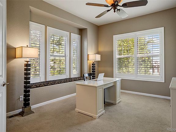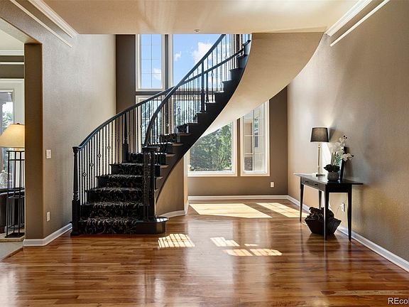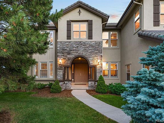 This gorgeous 5 bed | 6 bath home, located in the gated Village at Castle Pines community, is regally situated on a cul-de-sac street on an almost 2/3-acre lot with enormous backyard, sport court, and ample outdoor entertaining space! On entry, you’re greeted by a grand foyer with elegant spiral staircase. You’ll also find a private office, bonus room, powder room, and dining room. An en suite bedroom, laundry room, and 3-car garage access are located down the hall. Moving through a butler’s pantry with huge walk-in pantry, you’ll find the heart of this special residence: a majestic open-concept kitchen + great room with gas fireplace, bar area, statement-making custom library loft and 2nd staircase. Complete with high, vaulted ceilings, oversized windows, and access to one of the largest yards and patios found in the neighborhood, you won’t want to leave this inviting space. The kitchen is equipped with double ovens, 2 upgraded dishwashers, and a granite island with added dining area. Upstairs, the oversized primary suite includes a separate sitting area, gas fireplace, and luxurious en suite bathroom featuring dual vanities, large built-in tub, glass-faced shower, and huge walk-in closet. A separate upper wing houses 3 more bedrooms, one with en-suite bathroom, and an additional shared bathroom - providing ample space for all. The lower level offers a multitude of entertaining options featuring a wet bar with seating for 4, large recreation room, media room, and multifunctional bonus room with endless uses. A powder bathroom and a large, unfinished storage area perfect for expansion space finish off the lower level. Natural light, plantation shutters throughout, and cherry hardwood floors on the main level add to this home’s appeal. Featuring a large, partially covered stamped concrete patio, multi-functional sport court, and flat, manicured lawn surrounded by lush, mature landscaping, this home is the pathway to the indoor - outdoor Colorado lifestyle you crave.