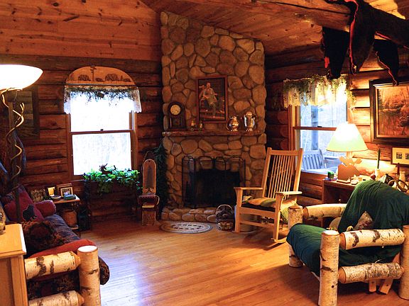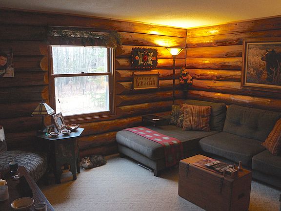 Beautiful log home built with full logs from Oulu! This gorgeous home on 5 wooded acres offers privacy and country living just a few miles from town. Enjoy the open spaciousness of the kitchen, living and dining great room with beautiful stone fireplace. New main floor bath has separate shower and tub and beautiful tile work. The screen porch in back is a lovely space to sit, unwind and enjoy the beauty of the property. Outdoor shower is a unique bonus. Large walkout bedroom in the lower level. Large loft bedroom on 2nd floor.