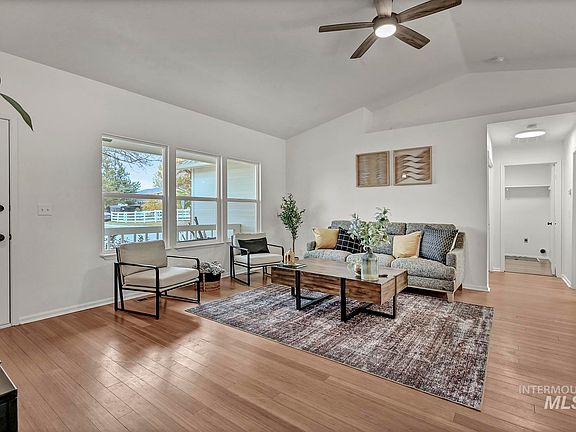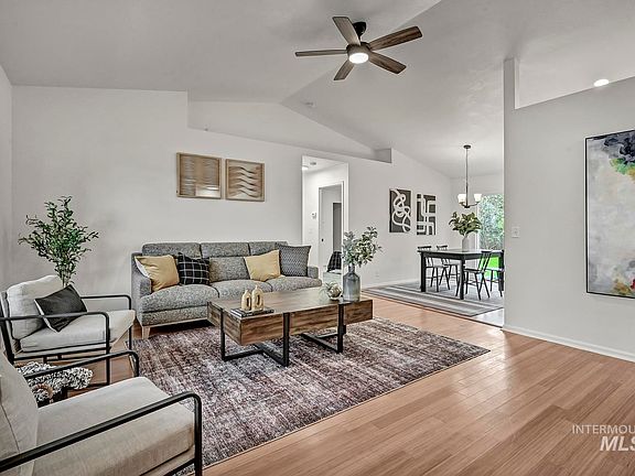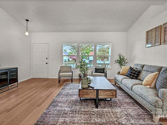 Discover this inviting home nestled in a friendly neighborhood close to everything! Featuring vaulted ceilings & ample natural light from huge windows, this clean modern home offers a perfect blend of comfort & style. With fresh interior & exterior paint, & a new roof & plush carpeting (installed in 2022), this home feels modern & revitalized. Enjoy sleek bamboo flooring & the convenience of an open kitchen with a spacious pantry. The updated light fixtures & new door & cabinet hardware throughout add a contemporary touch, while the large laundry room & tiled bathroom floors provide practical yet stylish living. Head out the dining area slider to the large private backyard with mature landscaping that is ideal for gatherings of friends & family. Nearby schools (just blocks away), grocery stores (~1 mile), the Boise River (~1.5 miles), & foothills trails (~2 miles) offer both convenience & outdoor enjoyment. Make this well-maintained property your new home & embrace a comfortable lifestyle in a prime location!