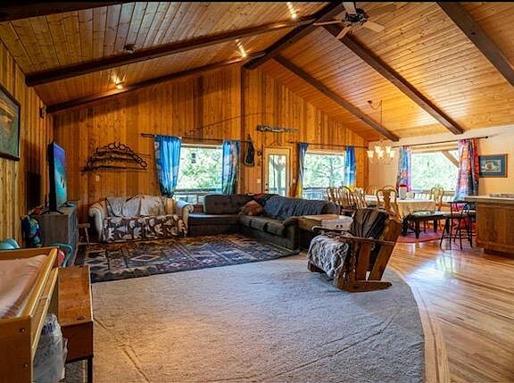 Escape to the Mountains -Year around access from County Rd. Custom Home Surrounded by Timber, Meadows, Pond, and Creek Bordering National Forest. This picturesque home, constructed in 2000, is nestled in a serene setting offering a total of 3720 sq/ft of living space. The main floor comprises a spacious living room, vaulted ceilings with tongue and groove finish, dining area, kitchen, office, laundry room, primary suite with 2 walk-in closets, primary bathroom, and a half bath (1800 sq/ft). On the upper level, you'll find a family/bonus room, bathroom, and the 2nd & 3rd bedrooms (960 sq/ft). The property is equipped with a central vacuum system, whole house propane generator, heat pump with AC, woodstove, a shop, and a carport. Additionally, the land is fully fenced and comes with water rights to the meadow. The basement features a pantry, safe room, and a modern studio apartment with a kitchenette and bathroom (960 sq/ft), as well as a 2-car finished garage. Subject to a partition