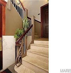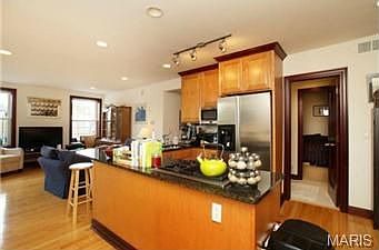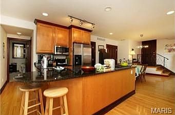 Fabulous 2 bedroom, 2 bath condo in Demun neighborhood that was beautifully rehabbed in 2005 & boasts a lengthy list of updates. Wonderful open floor plan has large windows providing great natural light & hardwood floors throughout living room, kitchen & breakfast rm with striking contrasting mill work. Outstanding kitchen offers custom cabinets, granite counter tops, stainless appliances including gas range, dishwasher, built in microwave & refrigerator. French doors in Living Rm open to balcony. Master bedroom complete with walk in closet & full master bath with natural stone vanity top. Bedroom 2 has private entrance to full bath w/ bath having additional door to living area. New carpet installed in both bedrooms 8/2013. 1 car garage with remote entry (one space in a shared 2 car garage), stackable washer/dryer in unit, recessed lighting, storage area in basement, 2nd floor unit, Close to Wash U, Forest Park & SSM St Mary's Health Center, just a few buildings from City/County Line