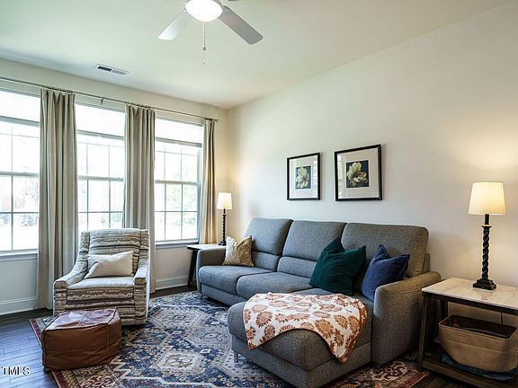 Welcome to this stunning townhome in Wendell Falls! The open-concept living space is perfect for entertaining and family gatherings. The living room features large windows that fill the room with natural light. The kitchen boasts granite countertops, stainless steel appliances, and ample cabinet space. Enjoy meals in the charming dining area that opens to the kitchen, featuring stylish accent walls that add a touch of character to the space. At the back of the first level, there is a powder room, built in shelving and a convenient coat closet near the entrance to the garage. On the second level, the primary bedroom includes an accent wall and plenty of space for relaxation. Additional bedrooms are spacious and well-lit. Storage cabinets at the back of the garage offer ample space for your belongings.