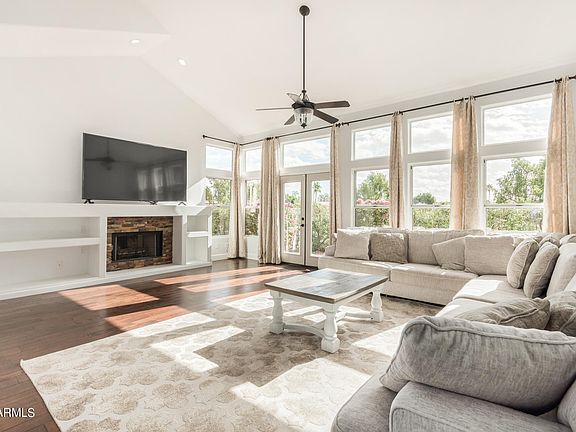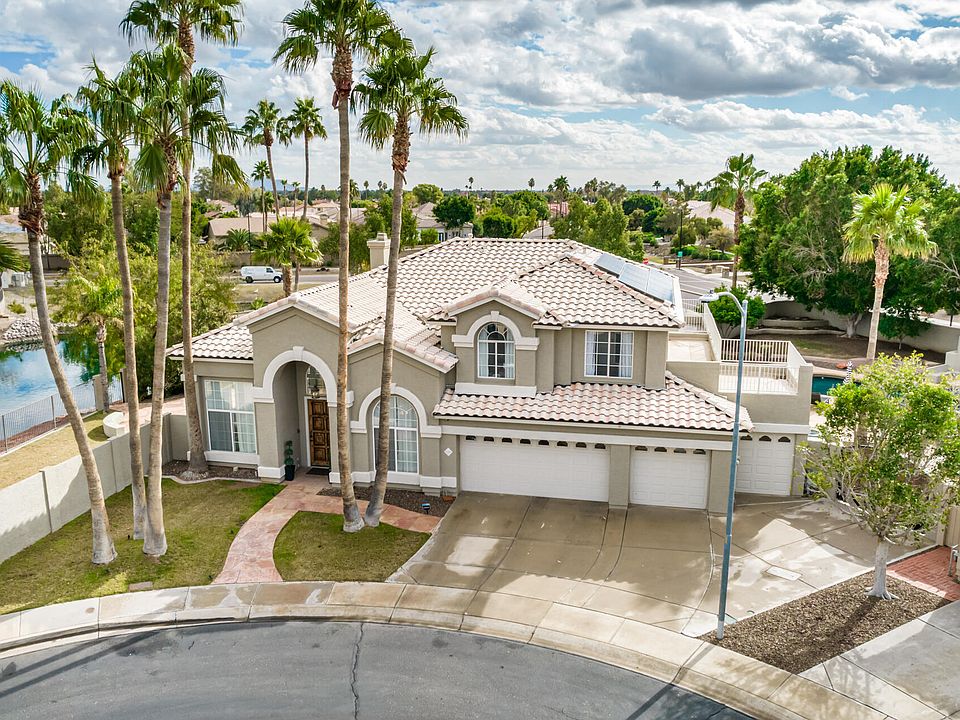 AMAZING two-story home offering WATERFRONT & MOUNTAIN VIEWS, along with 5 bedrooms, 3.25 bathrooms, spacious loft, bonus/workout room, 3,733 sqft, sparkling heated pool with spa, energy efficient prepaid leased solar (paid through December 2033), RV gate, 3.5 car garage, and an oversized cul-de-sac lot at 16,782 sqft in Arrowhead lakes. Once inside, appreciate the open floor plan, vaulted ceilings, real wood plank flooring, neutral color palette, designer touches throughout, and a welcoming formal living room and dining area. A bit further in, discover the gourmet eat-in kitchen equipped with SS appliances, gorgeous granite countertops, complementary colored tile backsplash, walk-in pantry, aesthetically pleasing center island w/large breakfast bar open to an inviting great room displaying a cozy fireplace for added warmth and ambiance. From here, you have convenient access to the fantastic side yard via a multi-panel glass slider embracing the essence of indoor/outdoor living. Imagine enjoying the built-in BBQ kitchen and the lovely extended flagstone patio providing ample room to entertain family and friends while partaking in some alfresco dining and gathering around the intimate firepit on those chillier nights. Venture along the winding path and explore the vast backyard boasting a playful sparkling pool with integrated spillover spa, custom built-in fireplace with extended seating, and a tranquil grass area. The two outdoor spaces span along a prime waterfront edge of Arrowhead lakes featuring a flowing waterfall and serene mountain and lake views. Back inside, make your way over to the primary suite downstairs highlighting a wonderful bay window, private access to the backyard, and an ensuite bathroom offering custom tile work encompassing dual sinks, deep soaking jetted tub separate from the walk-in snail shower, along with a private toilet and two large walk-in closets. Next, make your way up the ornate staircase and fall in love with the immense loft showcasing exquisite mountain views, a second primary suite offering an ensuite full bathroom, three secondary bedrooms, a guest bathroom, and an expansive shared balcony providing stunning views to enjoy. The .5 car garage has been converted into a bonus/workout room with its own A/C and the roof was replaced in 2020. This incredible home presents so many desirable attributes that you must see in person to appreciate, along with nearby top rated schools, so be sure to make an appointment today and take a look for yourself!