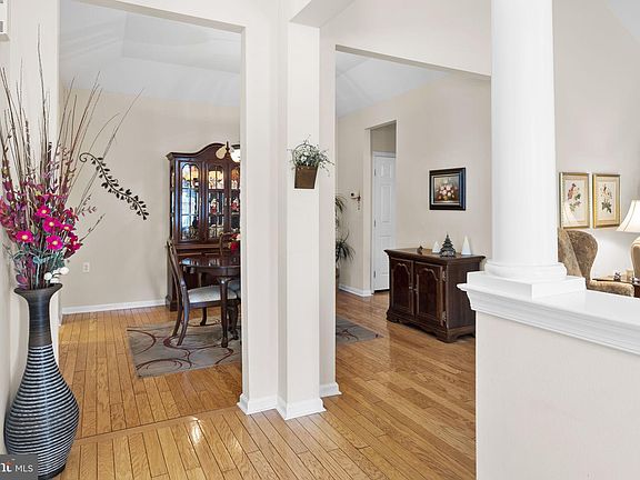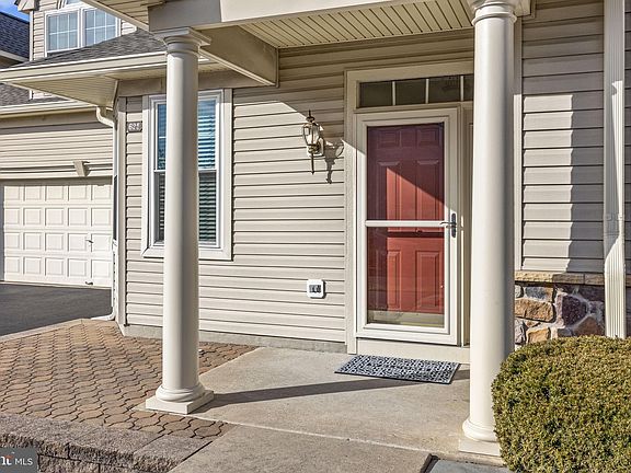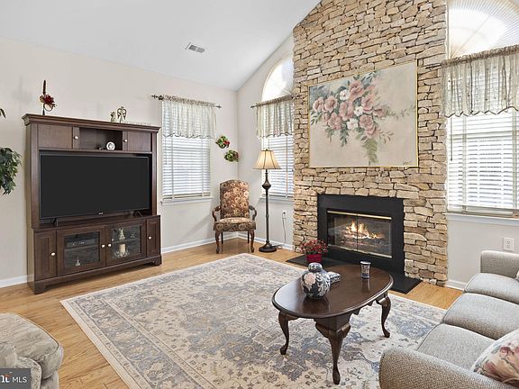 Welcome to 632 Bellflower Road in the highly desirable 55+ community, The Villages of Flowers Mill. This rare Realen built Awbury model quad will feel like home the moment you walk in the front door. Hardwood floors will guide you from room to room featured in the living room, dining room, kitchen and breakfast nook. Upon entering the living room you will be wowed by the stunning floor to ceiling stone fireplace. You'll love the elegant tray ceiling in the dining room that leads you to kitchen. There you will find granite countertops, 42" cabinets for ample storage space and decorative stone backsplash. Tucked away from the living spaces you will find 2 bedrooms and 2 full baths. The primary bedroom with en-suite features decorative plantation shutters, walk-in closet and additional double closet. The spacious primary bath includes a double vanity, stall shower and jetted soaking tub plus linen closet. Rounding out the main floor is a laundry room with access to 2 car garage and stairwell to a finished loft with additional storage room. Of note: Paver Patio, Windows 2018, Roof 2022, HVAC 2017