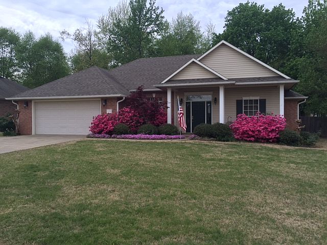 Move in ready! Beautiful 4 bedroom, 2 bath home surrounded by mature trees in a peaceful neighborhood. Split floor plan with eat-in kitchen and large island open to living room with vaulted ceilings and gas fireplace. Walk in closets and ceiling fans in every bedroom. New carpet, paint and handscraped wood floors. Master suite features tray ceilings, his/her sinks, whirlpool tub and separate shower. Double vanities in both bathrooms. Large windows create plenty of light filled rooms. Central vacuum system and floored attic. Spacious backyard, covered patio for entertaining & privacy fencing. Walk to schools and Vache Grasse. By Appointment Only Text or Call 479-763-5333